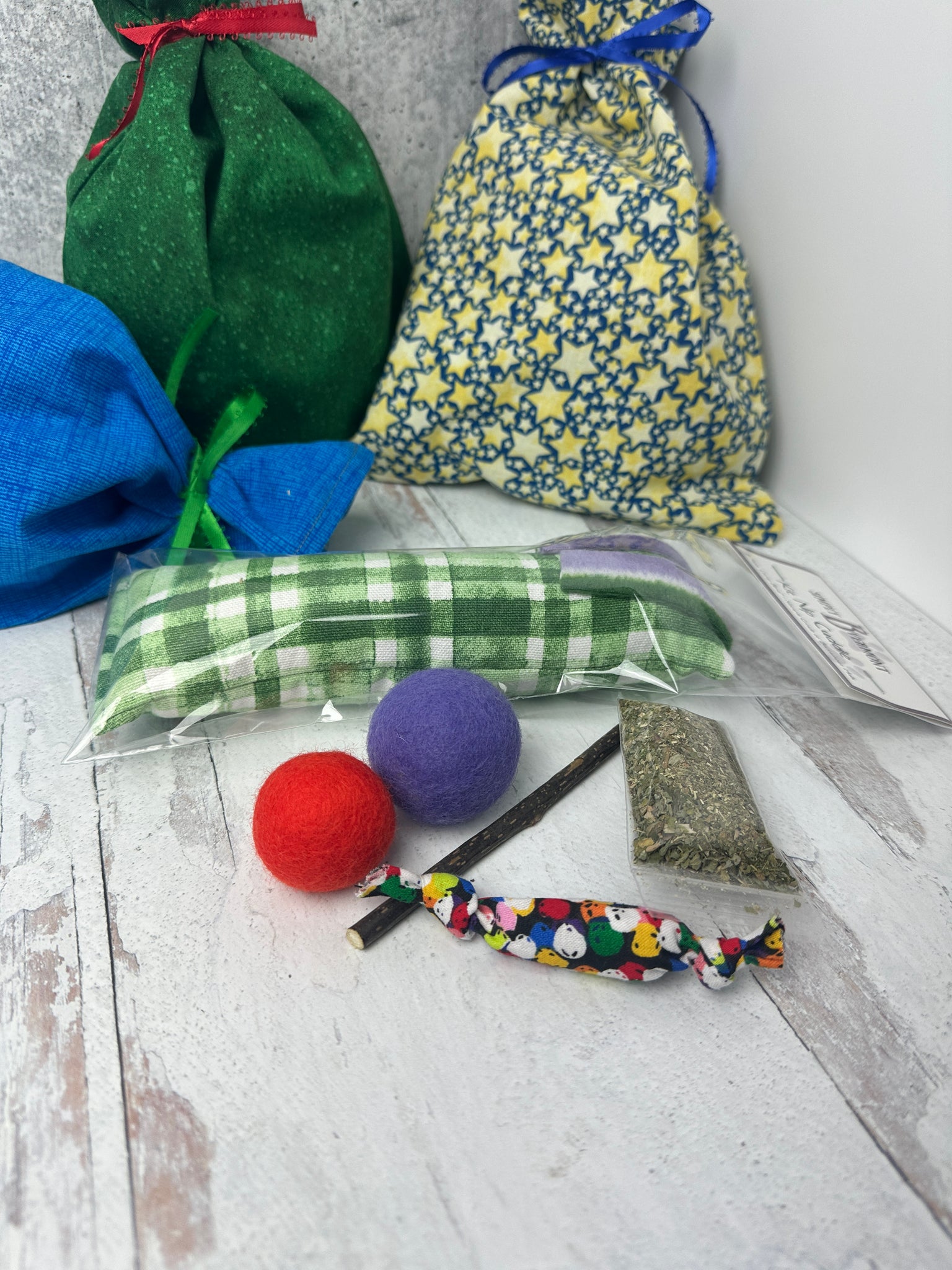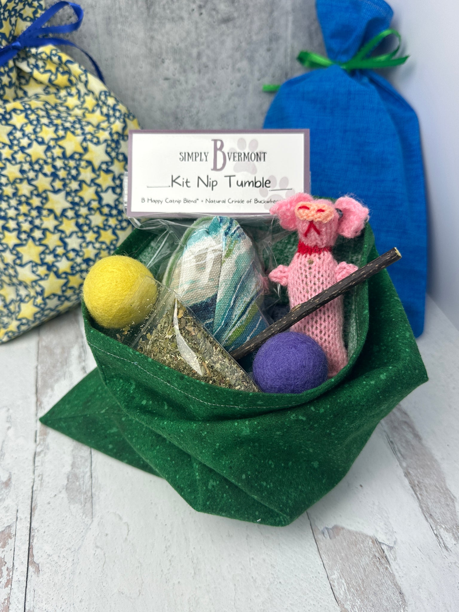 Catnip Toys featuring our custom catnip blend B Happy wrapped in a Re-usable fabric gift bag make the purr-fect gift for that special cat or cat person! Choose the gift bag color and the main toy style: (Kit Nip Kicker, Kit Nip Tumble or Kit Nip Cuddle) and we will do the rest!